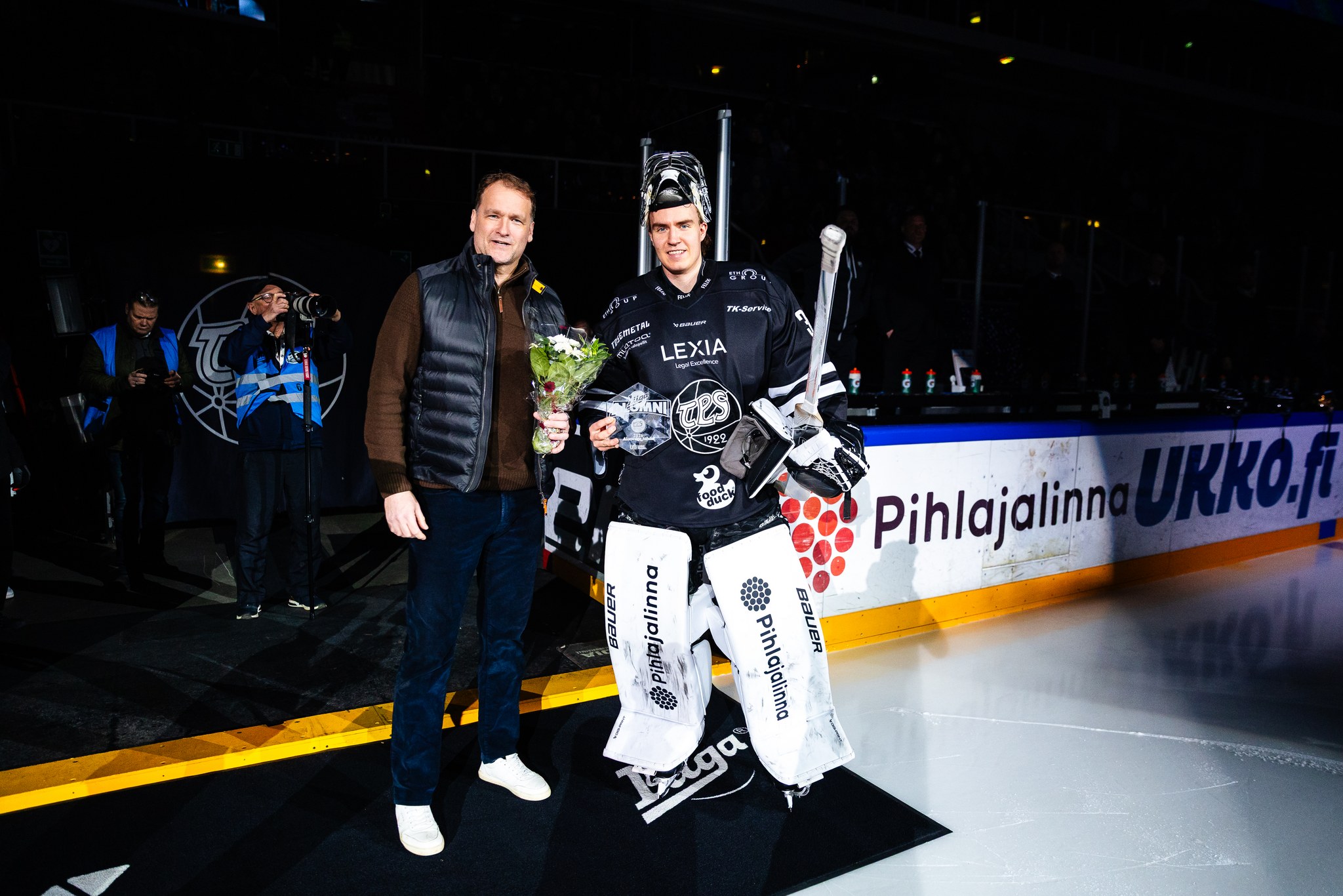 TPS Kapteeni Casimir Jurgens tuurasi kuume sairasta Max Lindrothia. Palkintoa jakamasssa Timo Salo ja Kari Kauppila.